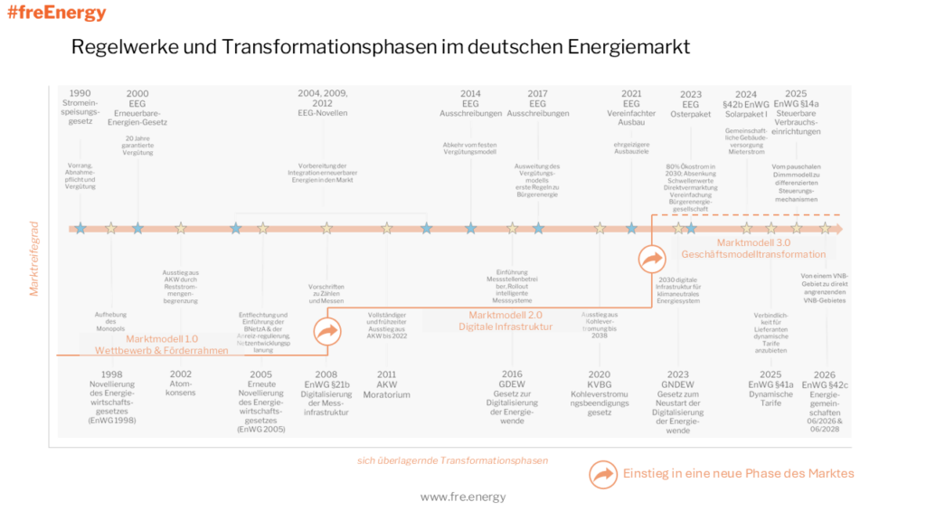 Betrachtet man die Zeitleiste, lassen sich vereinfacht drei Phasen ableiten. Nennen wir sie Marktmodell 1.0, 2.0 und 3.0. Die Grenzen zwischen den Phasen sind dabei bewusst grob gezogen – in der Realität überlagern sie sich. Jede Phase wurde durch einen gesetzgeberischen Impuls eingeleitet, dann durch Regulierung und Marktentwicklung weitergeformt. Und die Optimierung schreitet in vielen Bereichen bis heute fort.
